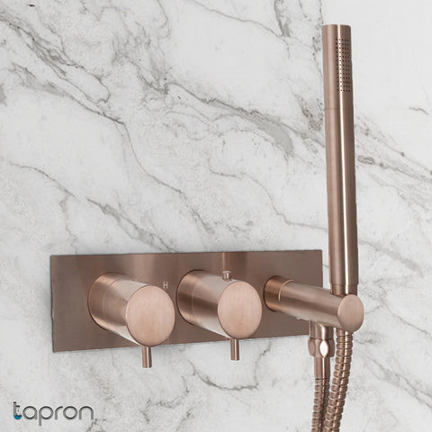 Enjoy precision, comfort, and style with the 2 outlet concealed shower valve with handset, thoughtfully designed for both practicality and sophistication. Made from solid brass and finished with a durable PVD coating, the brushed bronze surface brings a warm touch of character to the bathroom.