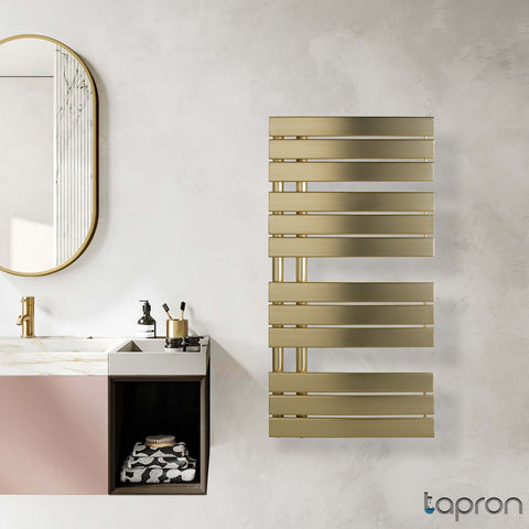 This brushed brass towel rail is crafted from premium quality steel. With an exquisitely designed layout with 12 sections, this dual fuel towel rail radiator boasts an impressive hourly heat output 1273 BTU, meaning you can enjoy a wonderfully warm and welcoming space in no time.